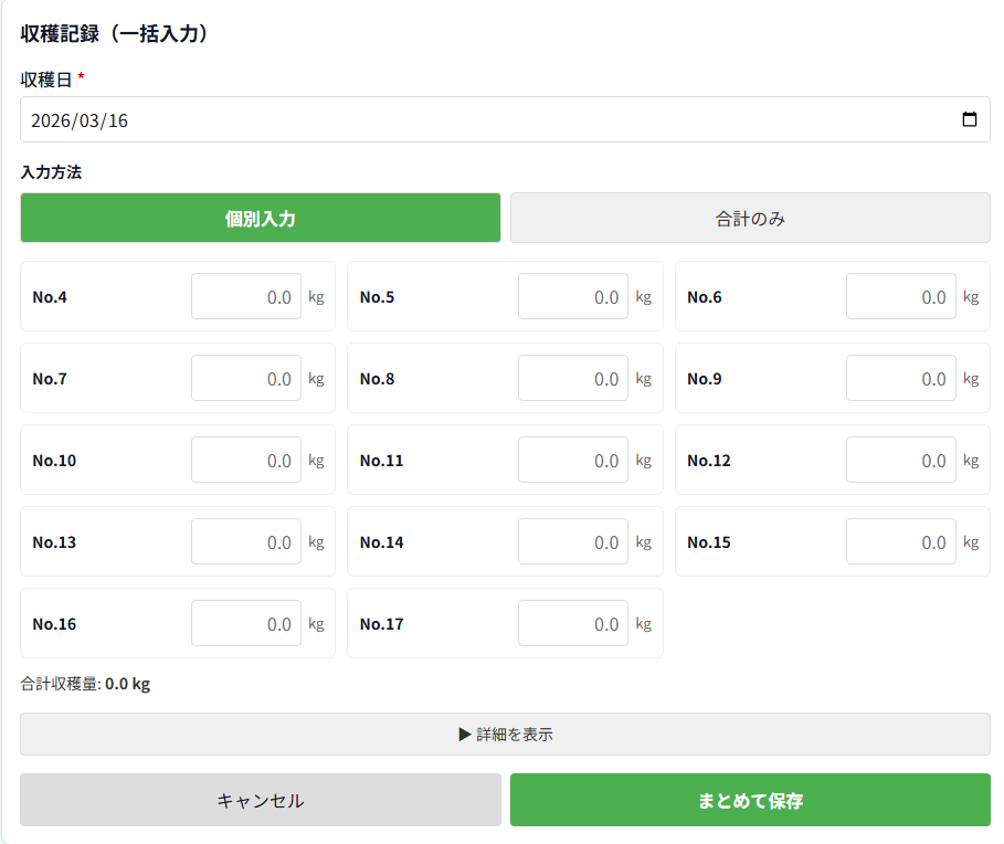 - 畝単位 × 個別入力:各畝に収穫量を入力