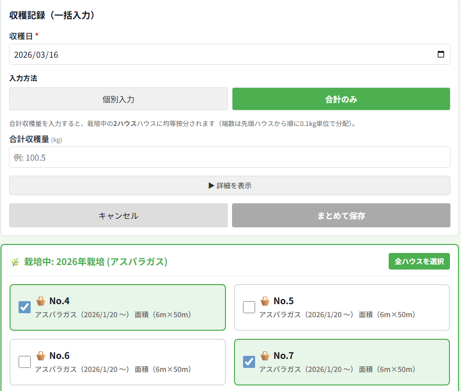 - 合計のみ:合計収穫量を入力して、選択したハウス数で均等按分する