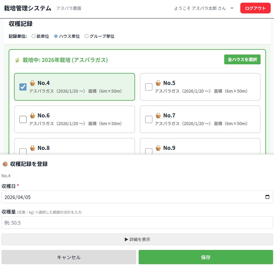 - ハウス単位 × 個別入力:各ハウスに収穫量を入力