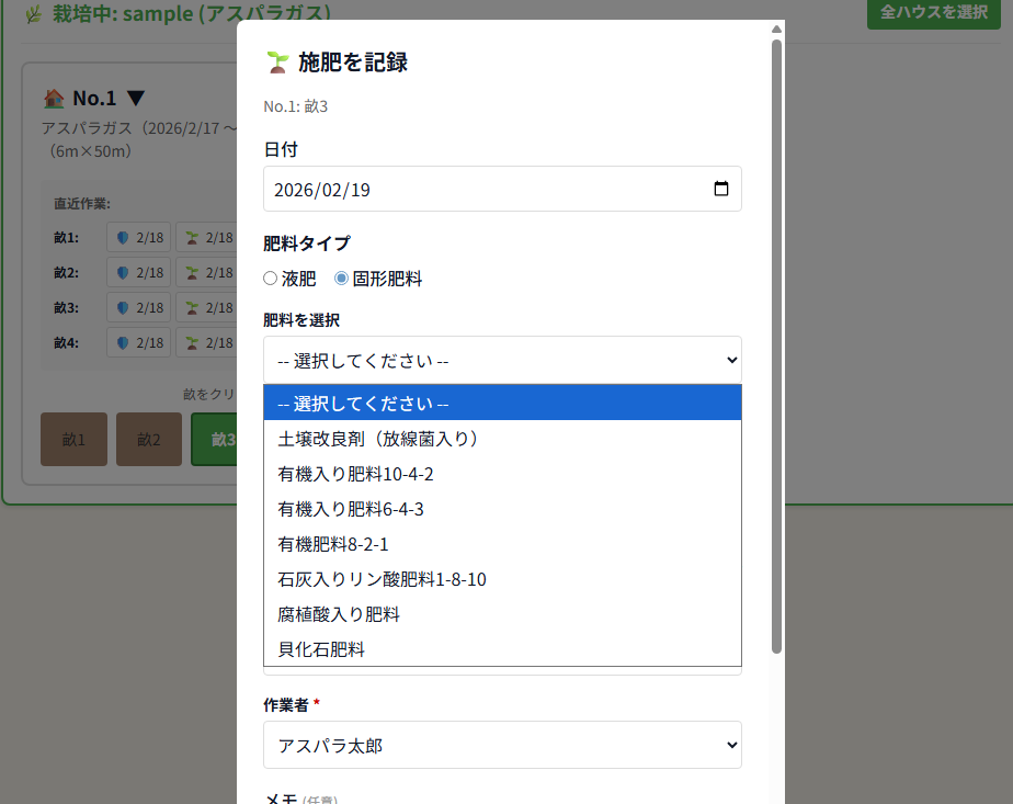よく考えれば、農作業の種類は農園ごとにある程度決まっています。それなのに毎回手入力するのは非効率でした。