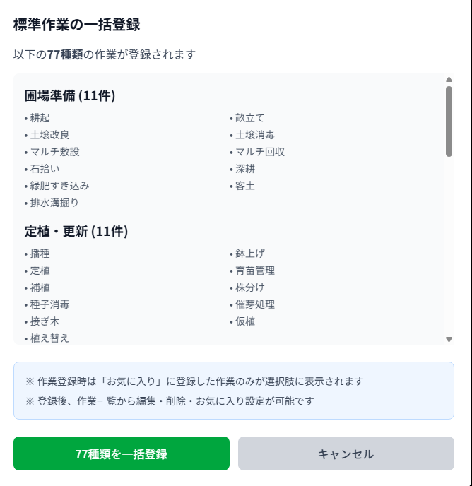 新規で農園を作る際に、ある程度の作業項目を一括登録できるようにしました。