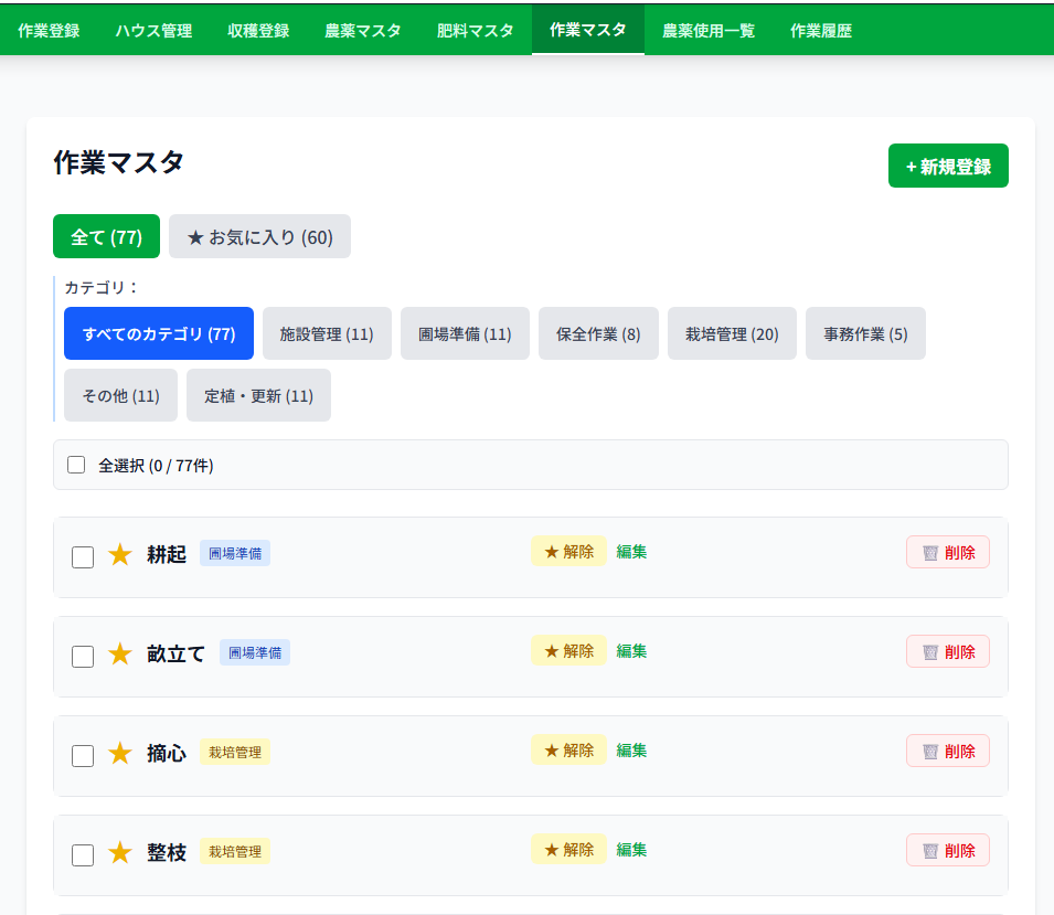 これで新規農園でも、最初から77件の作業項目が使える状態になりました。