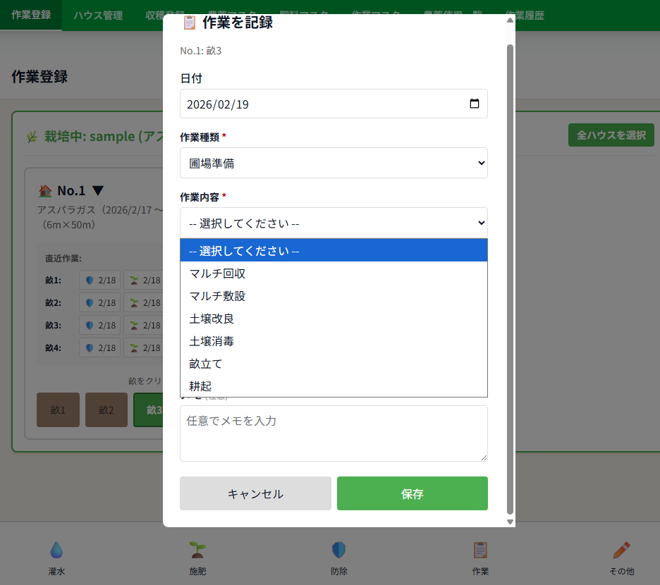 栽培管理アプリでは、日々の作業を記録する「作業登録」機能があります。現状では以下の項目が選択できます: