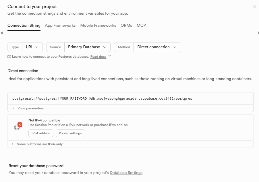 - ⚠️ ここで使うパスワードは、Supabaseプロジェクト作成時に設定したデータベースパスワードです