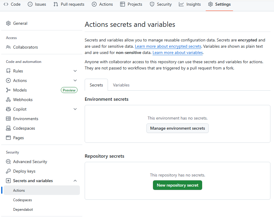 Secrets and variables→Actionsを選択 New repository secretをクリック- 以下の内容で登録: