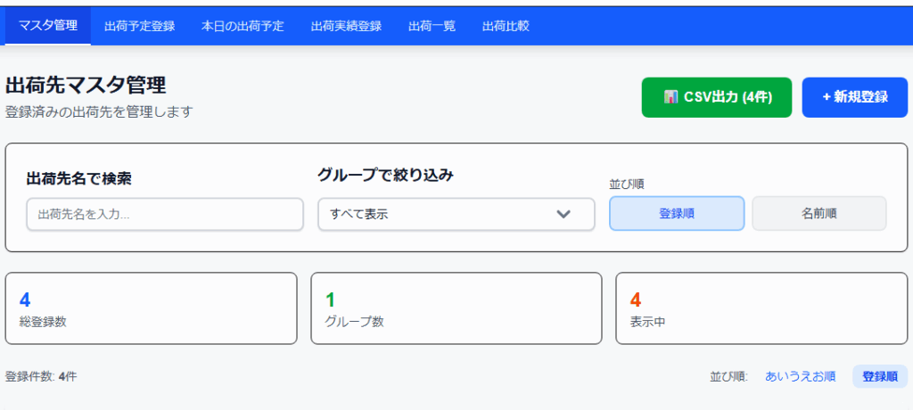 - 出荷先マスタのCSV出力:登録されている出荷先データを出力