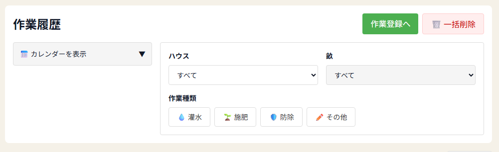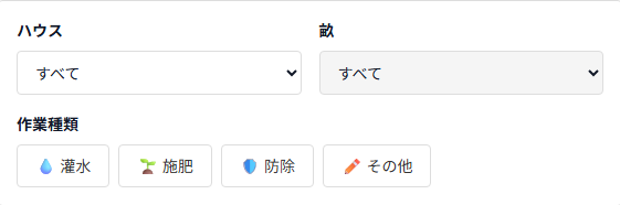 - 例:「No.1ハウス」+「灌水」= No.1で灌水した日だけ●